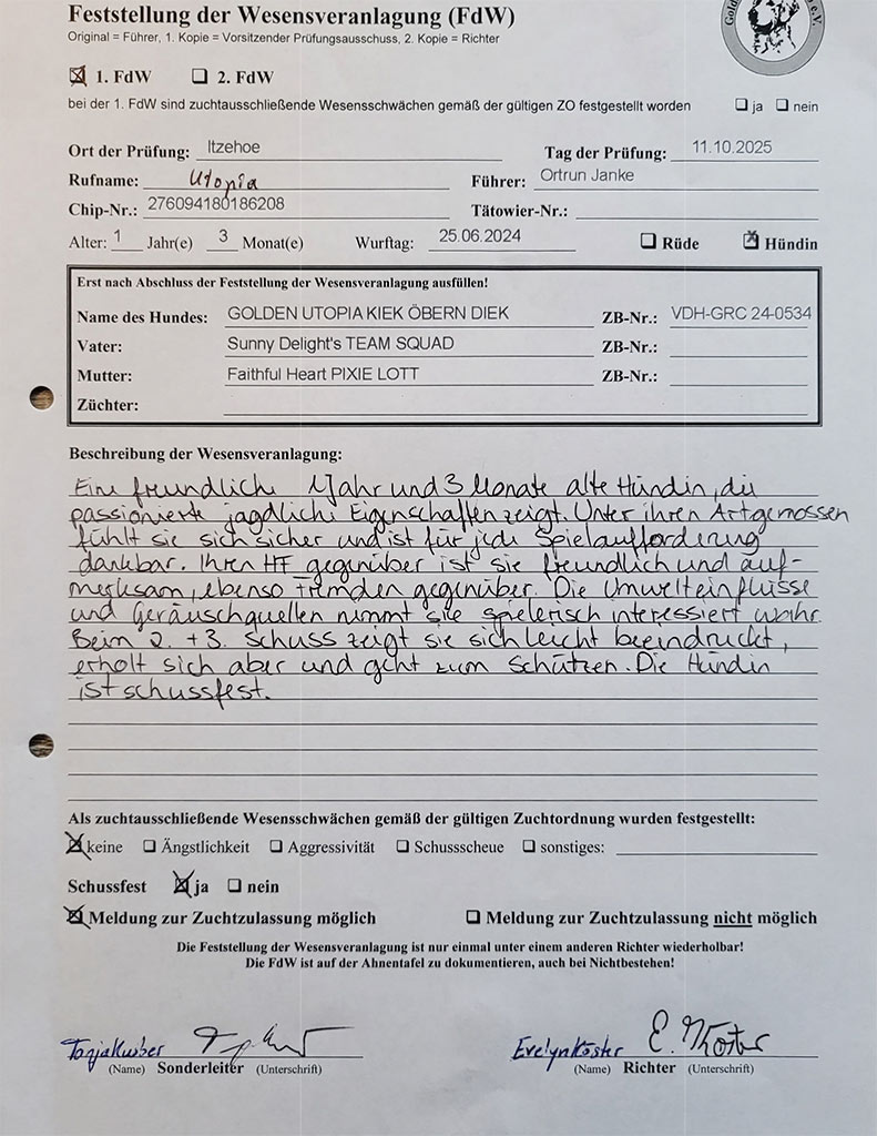 Wir haben im April und im Mai 2025 mit Golden Utopia kiek öbern diek (Sunny Delight’s Team Squad x Faithful Heart Pixie Lott) an zwei Ausstellungen in der Jugendklasse teilgenommen. Es waren Utopias erste Ausstellungen überhaupt. Unsere Kleine hat im Alter von 10 Monaten in Leipzig unter der Richterin Birgit Rabe (DE) den 1. Platz mit der Formwertnote vorzüglich gewonnen und ihre erste Anwartschaft Dt. Jug. Ch. VDH, CAC-J, Jugendsiegerin Rittergut Plaußig GRC e. V. 2025 bekommen.